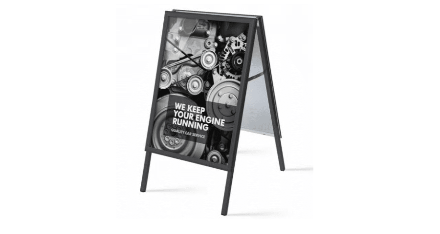 Schwerer doppelseitiger Kundenstopper mit schwarzem Aluminium-Klapprahmen für Postermaß 594 x 841 mm (DIN A1), mit UV-resistenter Posterschutzfolie, optimale Standfestigkeit und Stabilität, verzinkte Metallrückwand, Ausführung in edlem Schwarz (RAL9005).