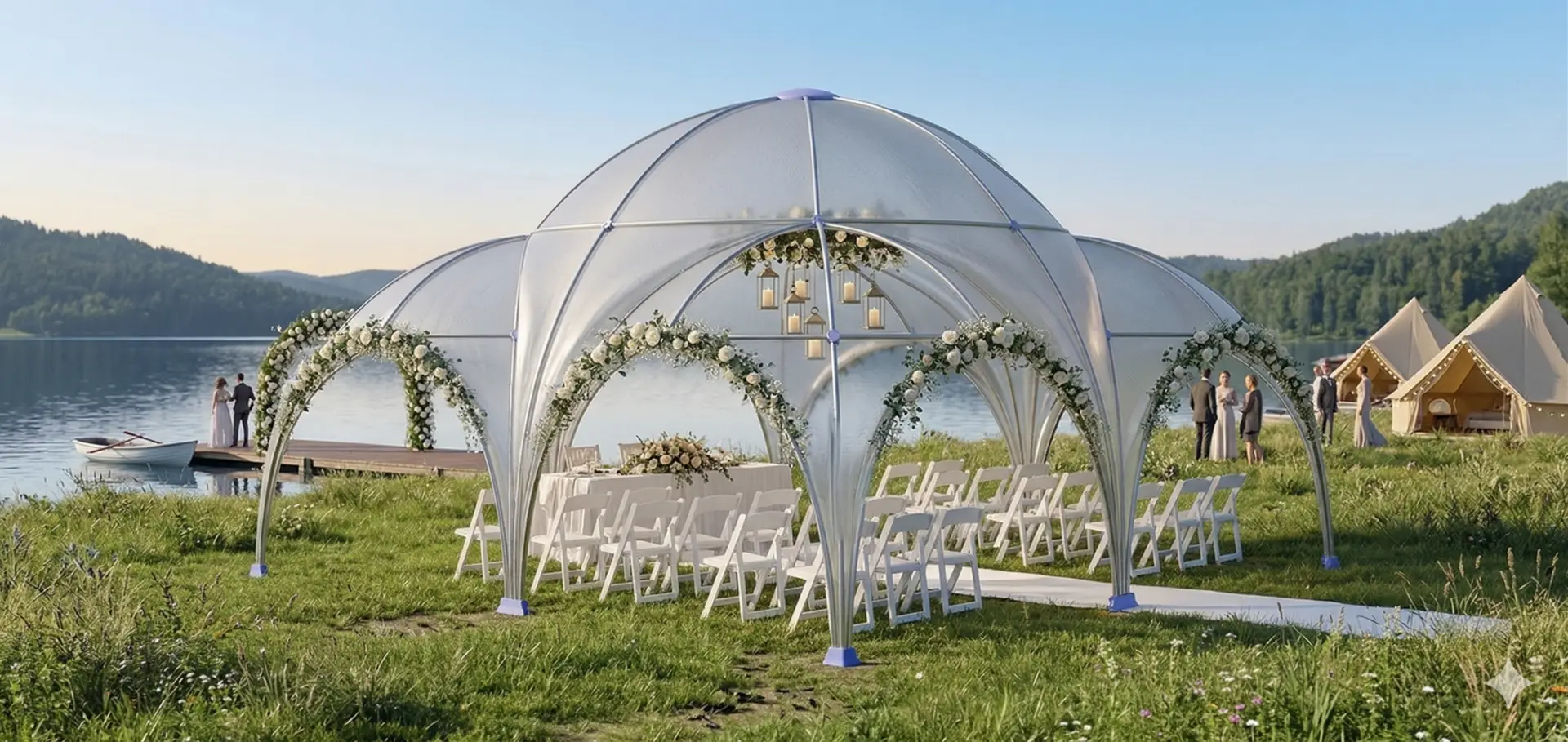 Crystal Clear (Transparent): Perfekt für den „Wow-Effekt“. Genießen Sie den freien Blick auf den See oder den Sternenhimmel, während Sie und Ihre Gäste geschützt feiern.