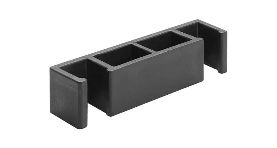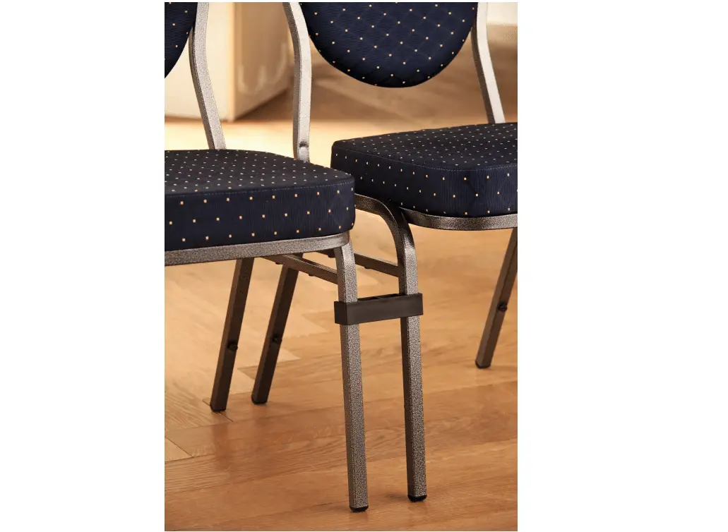 Praktische Verbindungen für den Bankettstuhl schwarz, die das Aneinanderreihen mehrerer Stühle zu Reihen für Konferenzen, Vorträge und Konzerte erleichtern. Die Verbindungsstücke halten die Stühle zusammen und verhindern, dass sie sich bewegen.
